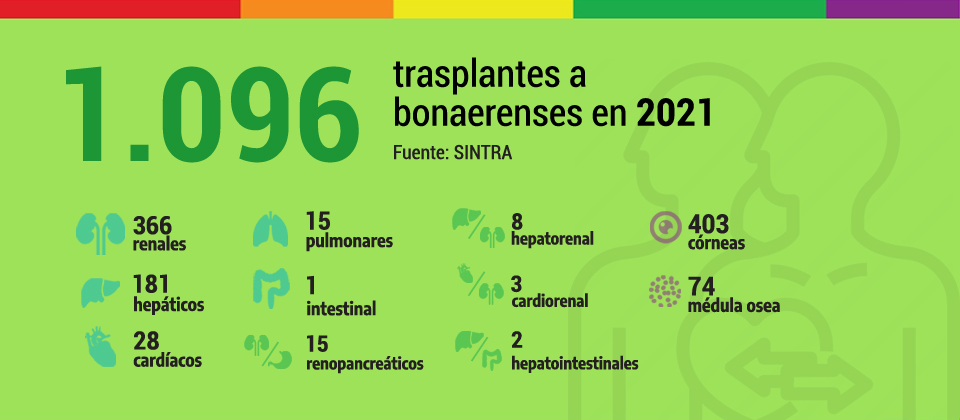 Durante el año 2021, gracias a la solidaridad de la sociedad, a la intervención de los establecimientos de salud y a un estado presente, 1096 bonaerenses fueron trasplantados. Del total 619 fueron trasplantes de órganos, 403 trasplantes de córneas y 74 trasplantes de médula ósea en Unidades Públicas de Trasplante.