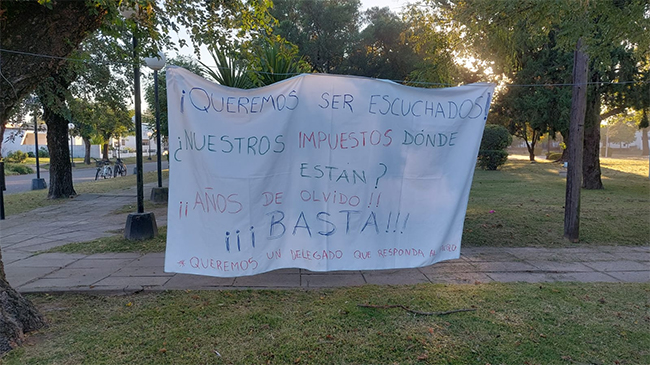 Frente a la Delegación se encuentra colocada una bandera en al que expresa el pedido de renuncia y una queja por el destino que tiene el pago de sus impuestos, a su vez se está redactando una carta que será enviada a las autoridades municipales y concejales detallando sus inquietudes. SEGUIREMOS INFORMANDO