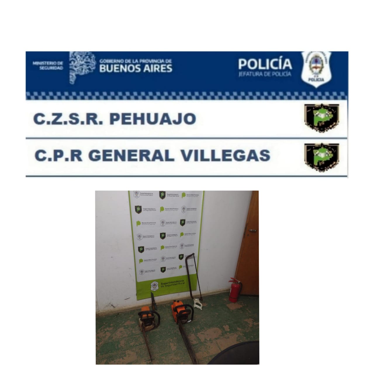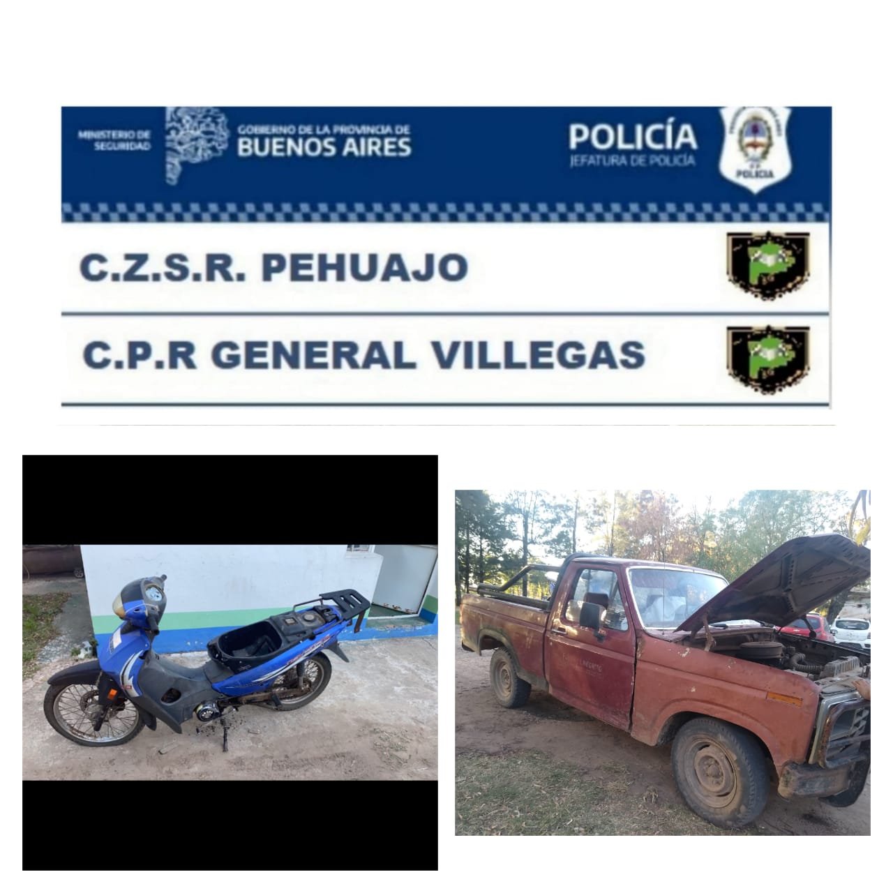 La pick up y la moto fueron secuestrados por infracción a la Ley 24.449, secuestrandose así mismo una sierra tipo carnicera mango plástico color blanco con restos de carne, dos motosierras marca Gama con restos de carne, un cuchillo sin marca visible, hoja de 20 centímetros aproximadamente con vaina; respecto a la carne faenada se procedió al decomiso por parte de personal de Bromatología Municipal de General Villegas.