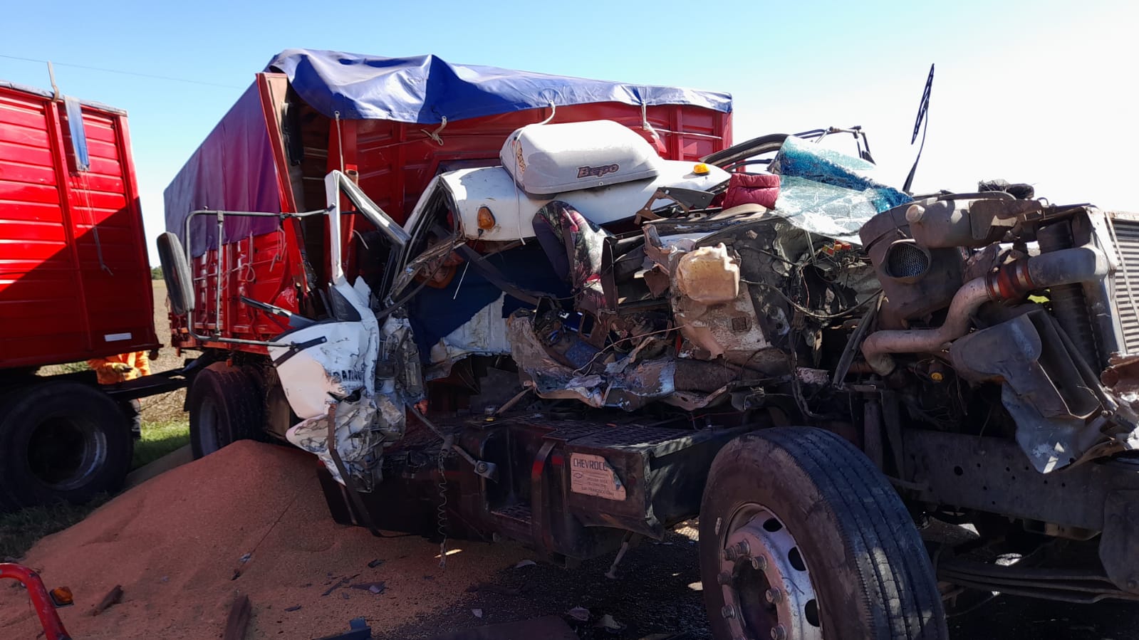 El camión siniestrado está de regreso a Pinto con un auxilio; la carga derramada del chasis que se pudo recuperar está siendo trasladada a Rosario que era el destino del camión Chevrolet.