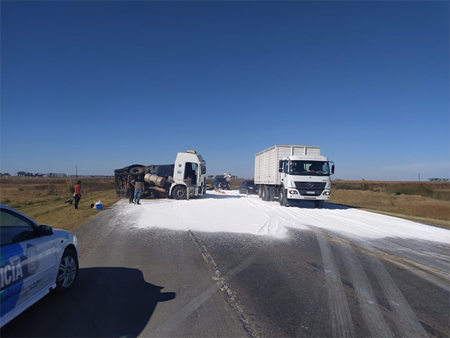Como consecuencia el auto queda en la banquina y el camión vuelca sobre la cinta asfáltica derramando su carga.