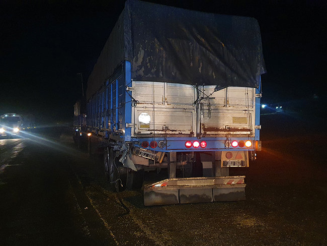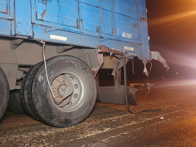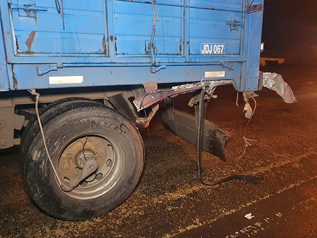 por lo que se aprecia, el conductor en un acto reflejo y al ver que no podría evitar el choque maniobró hacia su izquierda dando con el lado del acompañante de lleno en el extremo trasero izquierdo del acoplado.