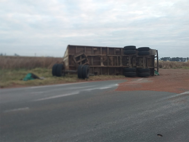El camión un Ford cargo 1832 volcó el acoplado cargado con sorgo por un desperfecto, quedando la parte trasera de éste sobre la cinta asfáltica y parte de la carga.