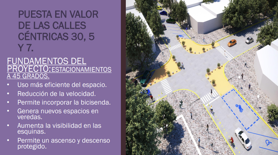 – Replantear el estacionamiento, implementando el modo 45° para mantener una importante cantidad de plazas de estacionamiento por cuadra.