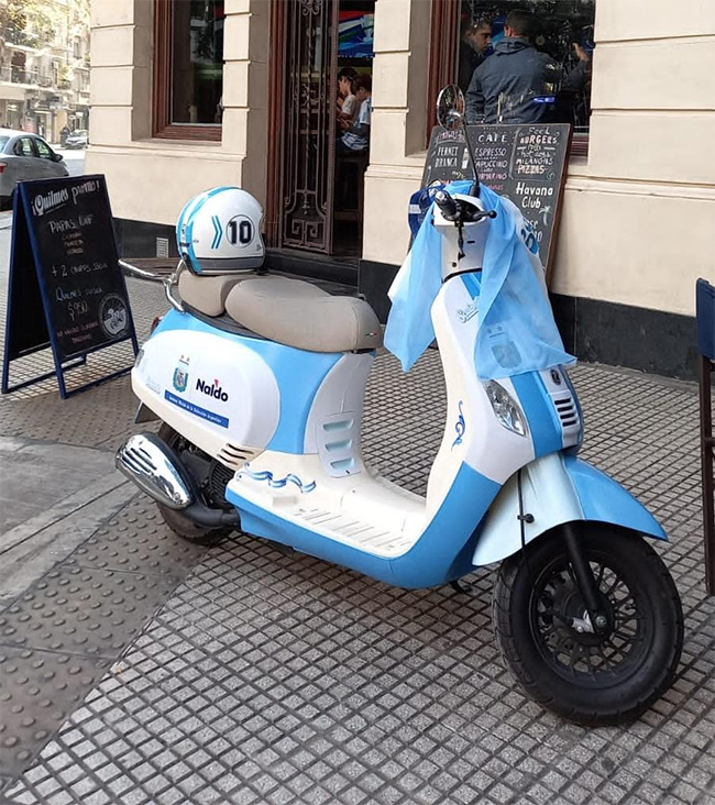 La «Scaloneta» es una moto de estilo italiano, celeste y blanca, identificada con los logos de Naldo y la Asociación del Fútbol Argentino (AFA). El día de su presentación generó una amplia repercusión en programas deportivos y público en general, que se expresó en las redes sociales a través del hashtag #subitealascaloneta