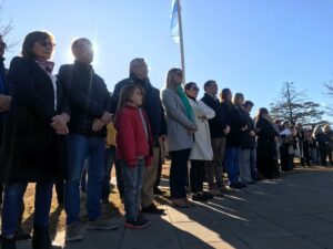 El Intendente junto a la delegada y el Presidente del Honorable Concejo Deliberante izaron el pabellón nacional y a continuación se entonaron las estrofas del Himno Nacional Argentino para que seguidamente el Padre Joselo Rossi realice la bendición.