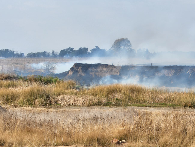 El fuego está vez inició aparentemente en la cava que se encuentra en la intersección de la Ruta y un camino vecinal, que funciona ilegalmente como un depósito de basura y ahora también ramas y desde allí se propagó por el préstamo hacia la banquina impulsado por el viento y alimentado por las gramíneas secas.