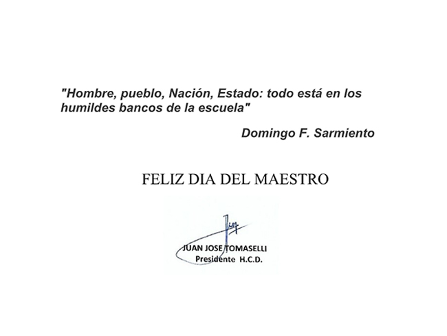 Como cada año y cada fecha importante, que involucra a los hombres y mujeres en sus actividades destacadas en la comunidad el Concejo Deliberante de General Villegas, con la firma de su presidente, hace llegar su saludo a modo de agradecimiento y reconocimiento por su labor en la sociedad.