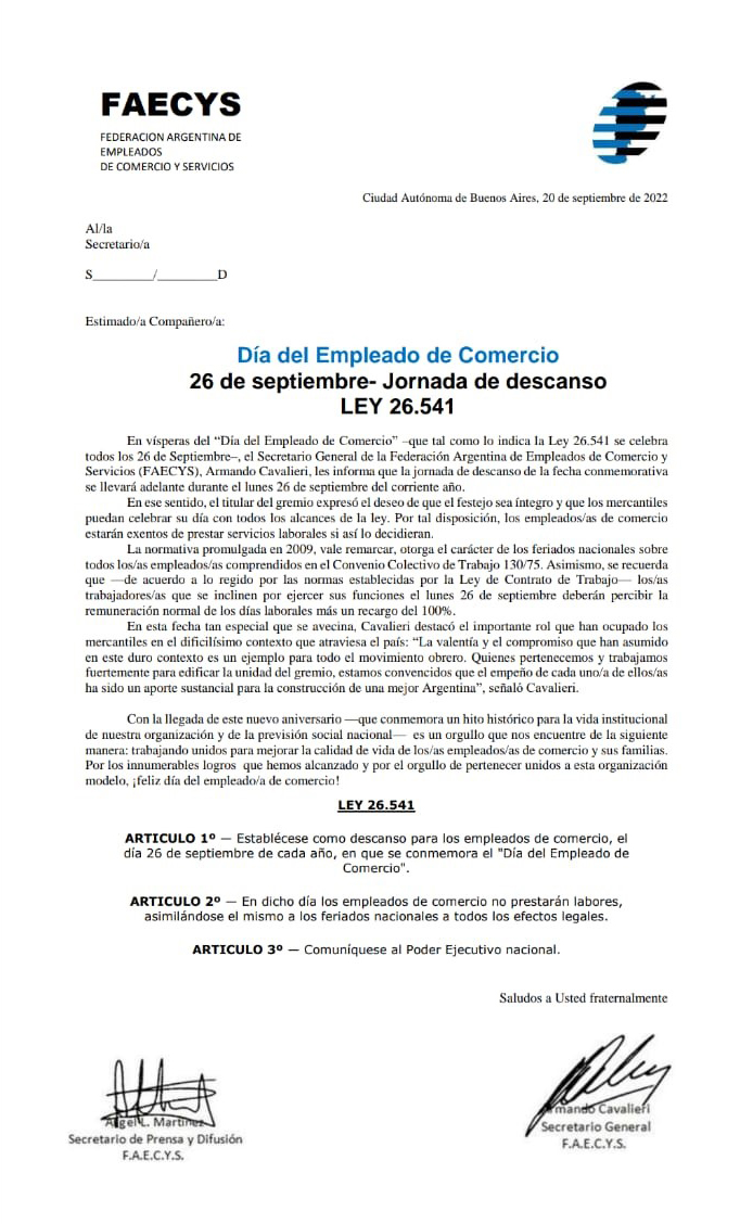 La normativa promulgada en 2009 le otorga a los 26 de septiembre el carácter de feriado nacional sobre todos los/as empleados/as comprendidos en el Convenio Colectivo de Trabajo 130/75. Asimismo, se recuerda que —de acuerdo a lo regido por las normas establecidas por la Ley de Contrato de Trabajo— quienes se inclinen por ejercer sus funciones el próximo lunes deberán percibir la remuneración normal de los días laborales más un recargo del 100%. Es decir, cobrarán como si se tratara de un feriado nacional.