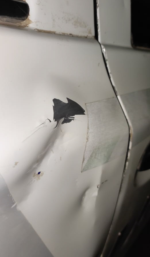En lugar personal policial es recibido por un sujeto mayor de edad, de unos 30 años, quien se encontraba fuera de la vivienda, exaltado e inicia arrojando piedras hacia los uniformados, dando una de ellas en el vehículo policial produciendo abolladura en puerta trasera derecha, lado del acompañante, dándose a la fuga y siendo interceptado y aprehendido a unos 500 metros del lugar.
