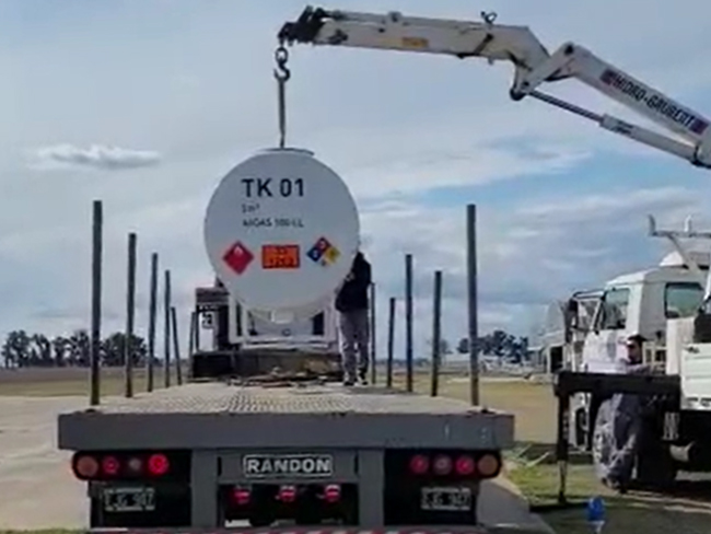 Desde hace una horas arribaron al aeródromo la cisterna de 5.000 litros y el surtidor, resta la obra civil que los pondrá en funcionamiento, la que podría estar en funcionamiento en el mes de diciembre.