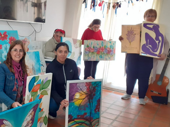La profesora Claudia Capponi y sus alumnas entregaron esta mañana cuadros a los residentes del Hogar.