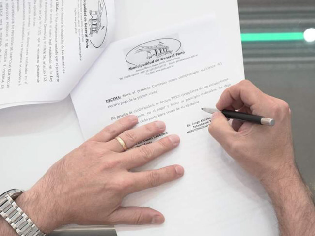 El intendente Freddy Zavatarelli firmó un convenio con la Cooperativa Eléctrica y Otros Servicios de Iriarte Limitada, para llevar adelante la obra de tendido e instalación domiciliaria del servicio de fibra óptica en esa localidad.