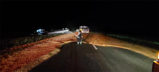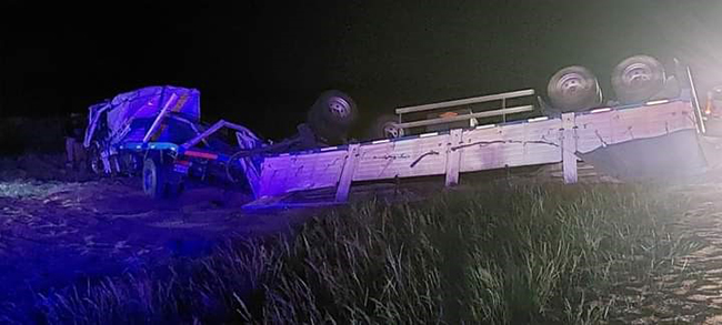 Pasada la medianoche, un chofer, oriundo de Tucumán, que circulaba por la Ruta 188 entre Villegas y Ameghino, perdió el control y volcó chasis y acoplado en el kilómetro 318, a la altura d ela bajada a «Los Andes».