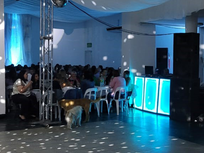 Esta noche, vísperas del Día del Trabajador municipal, los empleados de todo el distrito se reúnen para festejar en la sede del club Deportivo que ha sido decorada especialmente para este acontecimiento.