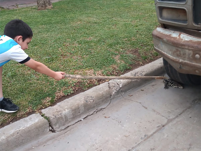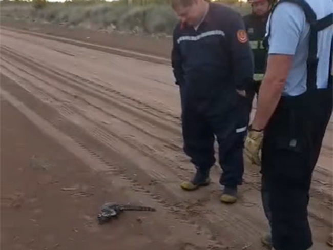 Al llegar la unidad N°6 divisó al lagarto, aparentemente joven, que se encontraba resguardado debajo de una camioneta estacionada.