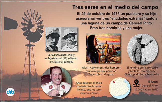 Octubre de 1973 fue un mes curioso para los devotos del misterio. En dos días ocurrieron dos casos notables en la provincia de Buenos Aires en los que testigos afirmaron ver ovnis y seres que no parecían de este mundo. Uno de ellos se convirtió en famoso: el camionero Dionisio Llanca fue abordado el 28 por dos hombres y una mujer cuando cambiaba un neumático cerca de Bahía Blanca y luego lo hicieron subir a su nave. El otro hecho no es tan conocido y sucedió en General Pinto, en la otra punta de la provincia, al día siguiente de lo que le pasó a Llanca. Los testigos fueron el encargado de un campo y su hijo, que vieron un grupo de tres personas: dos hombres y una mujer. Una casualidad que añade extrañeza al llamado “caso Balvidares”, por el apellido de los protagonistas, Carlos y su hijo Manuel. Ocurrió en un campo de Günther, a 25 kilómetros de la cabecera de ese partido del norte bonaerense, y aunque una investigación arrojó dudas sobre el caso hay quien continúa afirmando su veracidad.