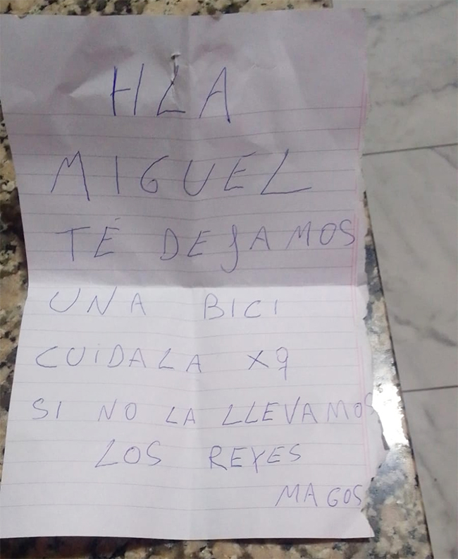 Como cada año «Migue», como lo llaman sus afectos más cercanos, preparó el pasto y el agua para los camellos y dejó sus zapatillas; esta vez, dada la situación económica, sabía que a lo sumo el regalo que le traerían sería una gorra, con lo que de antemano ya estaba conforme, pero jamás imaginó la sorpresa que lo aguardaba al cruzar la puerta que da a la galería abierta de su casa, una especie de garage abierto, donde estaba estacionada su flamante bicicleta, en la que había una nota dirigida al destinatario en la que le advertían (los Reyes) que si no la cuida se la llevarán.