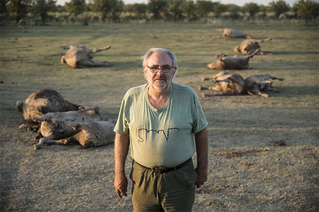 “Es la muerte anunciada porque de una sola aguada están tomando agua 1700 cabezas entre grandes y chicas. El problema es muy grave. Vinimos varias veces con las retroexcavadoras, pero ya no podemos ir más abajo porque se va a echar a perder el agua al infiltrarse agua salada”, explica. Al ver que hay una vaca que todavía está viva, la agarra de la cola y la trata de ayudar a levantarse; el animal se arrodilla, pero no tiene fuerzas para pararse y vuelve a desplomarse en el suelo.