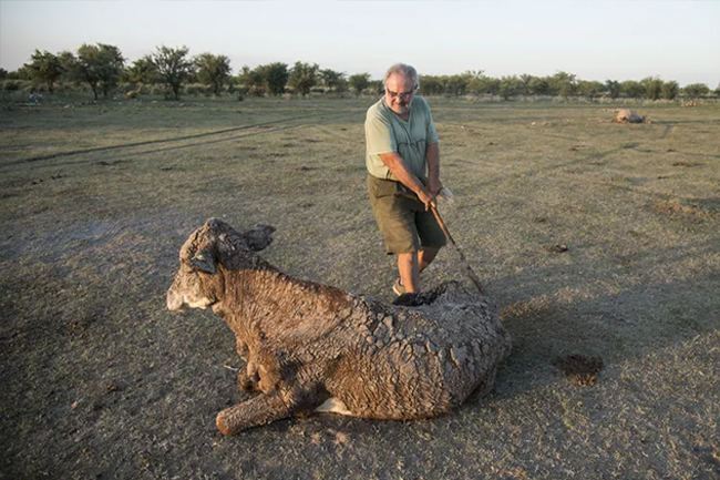 Gustavo Giailevra, de 62 años, productor ganadero, camina sin levantar la mirada para poder contener la emoción que le genera la escalofriante escena que ha dejado la falta de lluvias. Lo rodean los restos de al menos 60 de las 200 vacas que se le murieron en su campo ubicado en Pozo Borrado, en el departamento Nueve de Julio en esta provincia. En medio de lo que parece un cementerio de animales, hay un ejemplar que todavía agoniza.