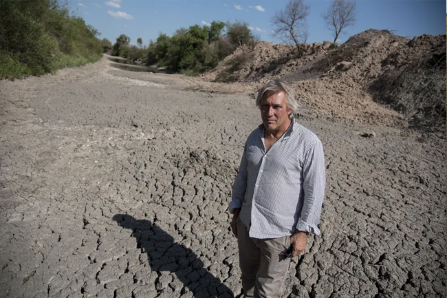 Su establecimiento, que tiene 4050 hectáreas está sobre el Rio Salado. “Acá tendría que haber al menos cinco metros de agua”, dice Gallart mientras camina por el cauce del río en donde ahora solo queda tierra reseca y algunos peces muertos. “Desde los 40 que no veo una situación similar de tener el río así de seco”, agrega.