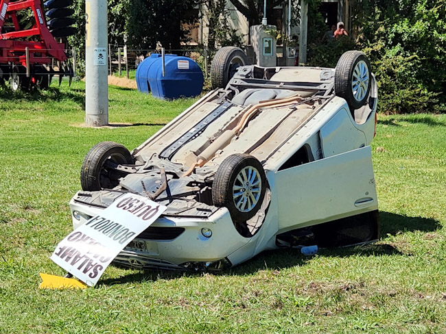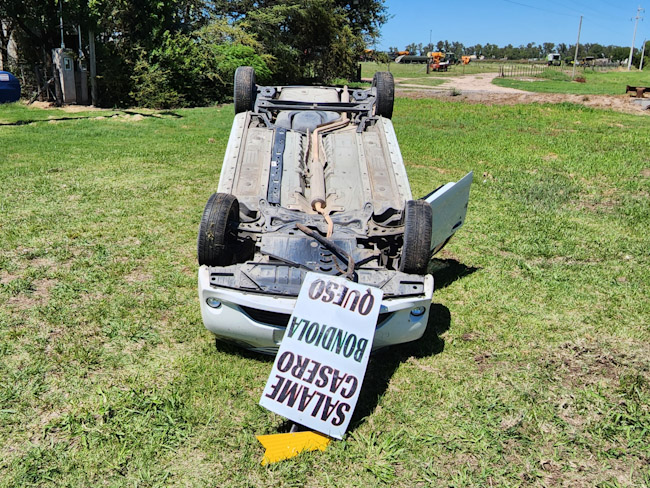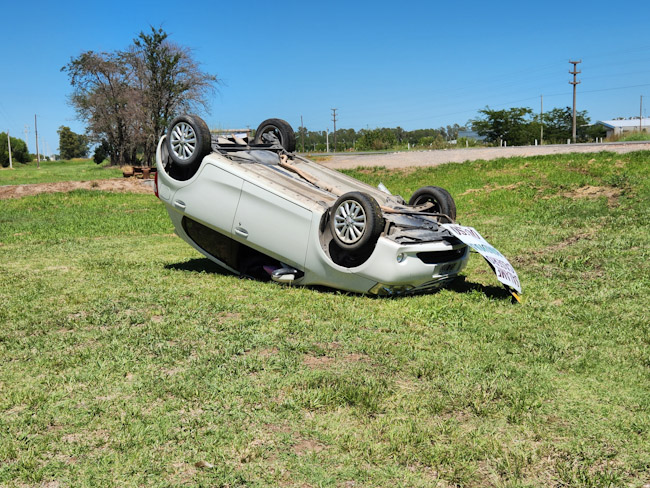 El vehículo quedó con las cuatro ruedas hacia arriba sobre el préstamo de su mano luego de pasar por arriba de la alcantarilla de ingreso a una propiedad que se ubica frente a la.planta de gas.