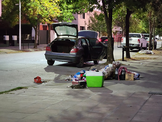 Inmediatamente estacionaron sobre la mano derecha (frente a Automotores Unión), descendieron del auto y comenzaron, con la ayuda de algunas personas que se acercaron, a bajar toda la mercadería que acababan de comprar en el supermercado.