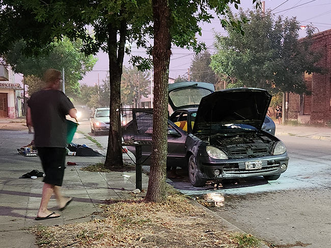 Mientras tanto haciendo uso del matafuego el conductor intentaba apagar las llamas que disminuyeron considerablemente y con la ayuda de un vecino que utilizó un balde con agua lograron extinguirlas por completo.