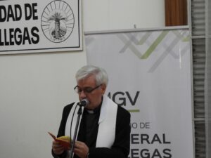 Luego que el Intendente junto a la Jefa de Gabinete Marina Justo y la Secretaria de Cultura y Deportes, Sandra Heredia, izaran el Pabellón Nacional el Padre Wargocki realizó una bendición.