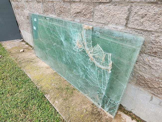 Los reiterados ataques dejaron las grandes láminas astilladas prácticamente en su totalidad, si bien no se rompieron del todo ya que cuentan con protección para que no exploten, era necesario por seguridad, y estética ser cambiados.
