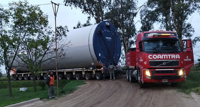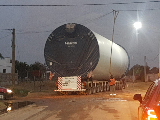 Esta tarde el inconveniente para el camión de la empresa Coamtra que transporta una parte de la base de un molino eólico que tiene como destino Bahía Blanca encontró un cable a baja altura para su porte debiendo ingresar a la localidad donde maniobrar no fue tarea fácil.