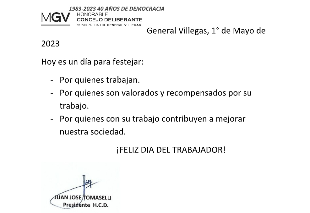 Como en cada fecha importante, el HCD, con la firma de su presidente, el concejal Juan José Tomaselli, hace extensivo a los trabajadores de todo el distrito el saludo y reconocimiento por su Día.