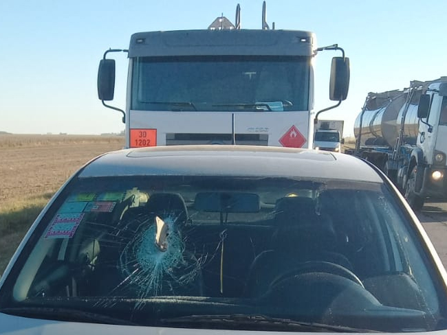 Se le partió la llanta a un camión e incrustó en el parabrisas a un remis de General Villegas
