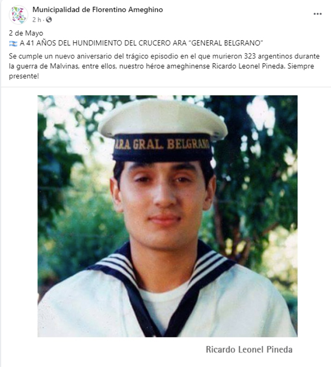 Se cumple un nuevo aniversario del trágico episodio en el que murieron 323 argentinos durante la guerra de Malvinas, entre ellos, nuestro héroe ameghinense Ricardo Leonel Pineda. Siempre presente!.