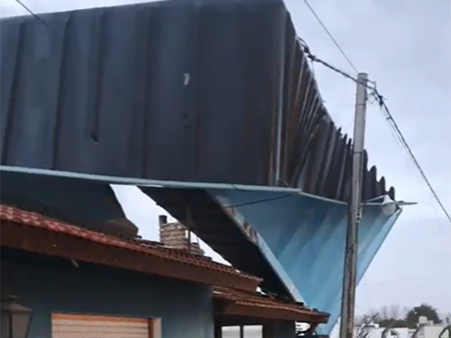 Un fuerte viento precedió a la llegada de la lluvia y ese viento levantó una pileta que se encontraba en un domicilio de calle Lojo de América. Fue tanta la fuerza del viento que la pileta que se encontraba desde el día anterior en un terreno aledaño a la casa terminó en el techo de la vivienda completamente doblada.