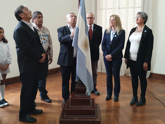 A continuación se llevó a cabo el acto protocolar en el Salón Dorado del Palacio Municipal. Allí luego de que el Intendente Campana, la Jefa de Gabinete Marina Justo, la Secretaria de Cultura y Educación, Sandra Heredia y los Ex Combatientes izaran el Pabellón Nacional y todos cantaran el himno llegó el momento de los discursos.
