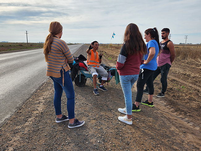 Esta tarde Distrito Interior lo entrevistó en un alto en el camino entre Piedritas y General Villegas, al llegar, hablaba con vecinos de este distrito quienes le acercaron un sándwich de milanesa, lo que agradeció especialmente en la entrevista que publicaremos en breve, en la que también se refirió a un hecho para el olvido vivido en una de las estaciones de servicio de Piedritas.