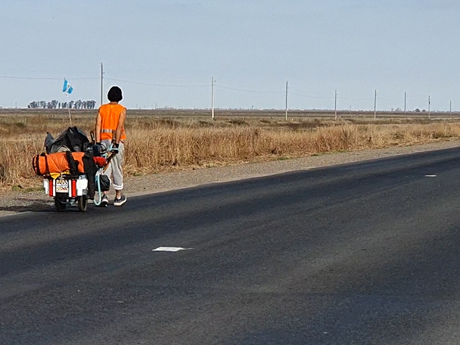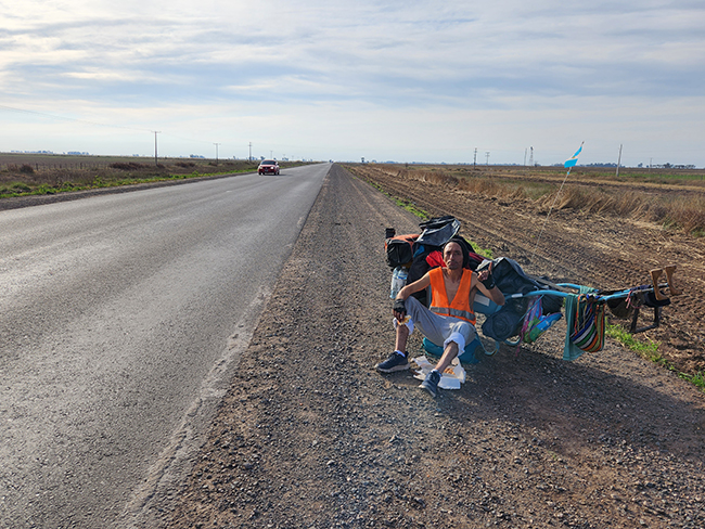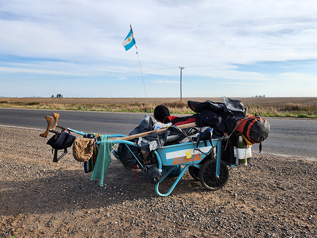 Esta noche probablemente duerma en el préstamo, a la intemperie para observar las constelaciones; mañana retomará y estará pasando por General Villegas con su carretilla adaptada sumando pasos para acortar la distancia con su meta.
