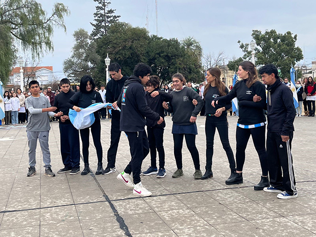 Luego del izamiento del Pabellón Nacional por parte del Intendente, la Jefa de Gabinete, la Secretaria de Cultura y Educación y la Inspectora Jefe Distrital se entonó el Himno Nacional Argentino y seguidamente la Inspectora Jefe Distrital Susana Garat, tomó la Promesa de Lealtad a la Bandera Nacional a los estudiantes.