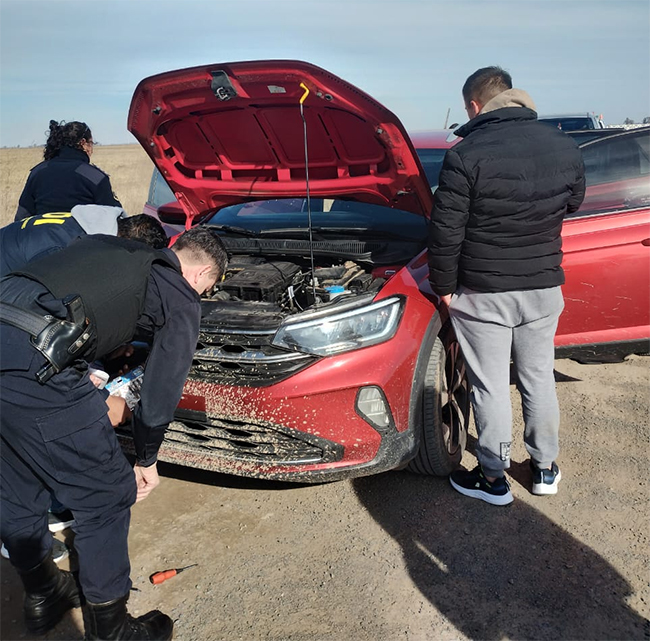 Esta tarde ante el alerta de vecinos de Banderaló que estaban siendo llamados por teléfono con argumentos compatibles con el Cuento del Tío, personal policial de esa localidad salió en la búsqueda de personas o vehículo foráneo, logrando la visualización de un Volkswagen Nivus color bordó con dos personas a bordo, los que al intentar ser identificados emprenden la fuga.