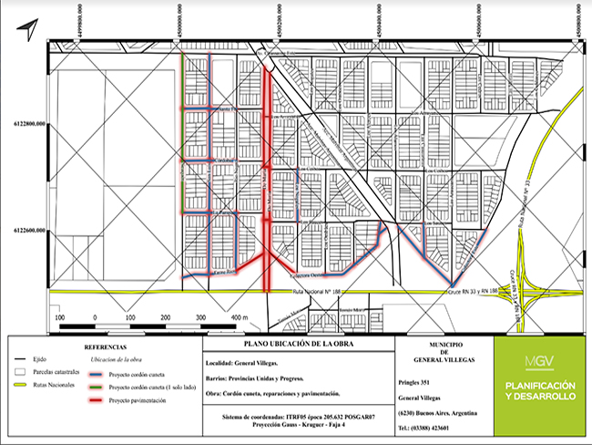 Se trata de un proyecto que abordará uno de los principales accesos a la ciudad de General Villegas y su zona aledaña, dotándola de 5300 metros lineales cordón cuneta, badenes de desagüe en toda la zona de obra y 9000 metros cuadrados de pavimentación sobre la calle De María, consolidándose como un acceso de jerarquía.