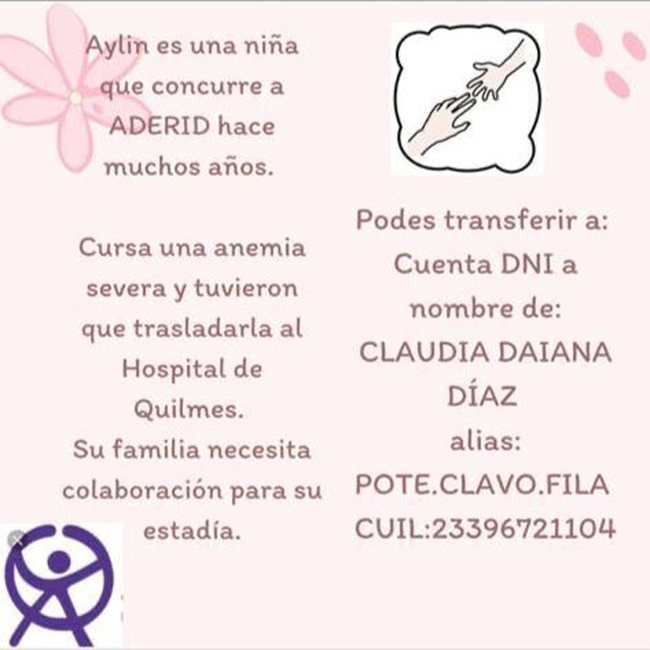 Aylín, es concurrente de Aderid desde hace mucho tiempo, tiene 8 años, cursa una anemia severa, por lo que tuvieron que trasladarla al hospital de Quilmes donde se encuentra internada.