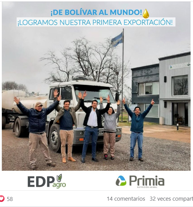 La empresa EDP Agro que tiene sede en Bolívar realizó su primera exportación de aceite de soja y lo celebró en sus redes sociales.