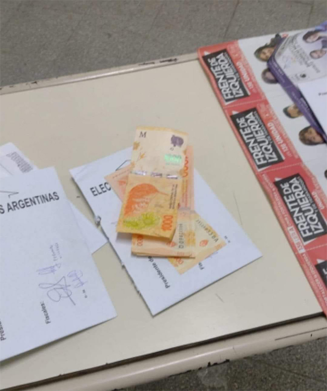 Tal como muestra la imagen cinco billetes de 1.000 pesos fueron hallados dentro un sobre cuando se realizaba el conteo de los votos de la mesa N° 18 en la Escuela Técnica de la ciudad cabecera del Distrito de Leandro N. Alem.