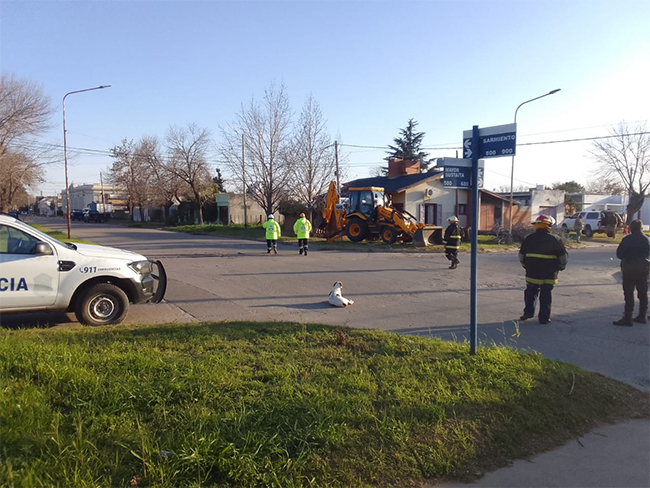 El equipo, perteneciente a un privado, se disponía a retirar un árbol cuando al introducir la pala perforó un caño de la red de gas, por lo que de inmediato se formó una nube que obligó a activar el protocolo, dando intervención a Bomberos y Defensa Civil, que pasada una hora y media permanece en el lugar preservando el sector de la rotura a la espera de la llegada de personal de la Empresa Camuzzi que proviene de Lincoln, para realizar la reparación. A su vez la Policía mantiene el tránsito restringido en los alrededores.