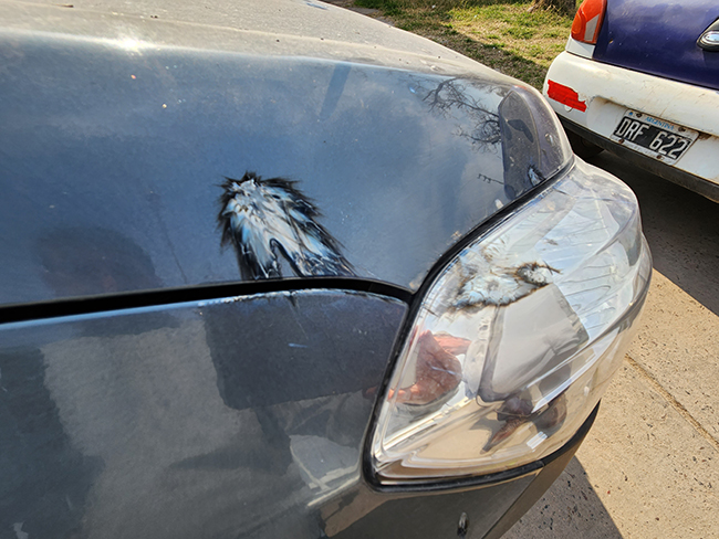 El animal que cayó al suelo lo hizo junto a elementos que se desprendieron producto del cortocircuito que provocó; éstos previamente cayeron sobre el rodado al que dañaron en su pintura y una óptica causando rayones y quemaduras.