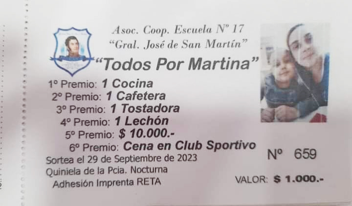 Para ello está en la calle la rifa de la escuela «Todos por Martina» cuyo valor es de $ 1.000 – Para solicitarla 3388 674113