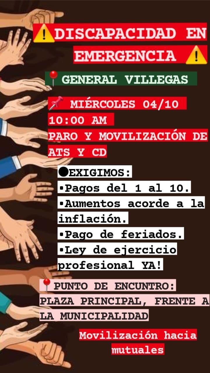 En el caso de General Villegas el miércoles habrá paro de los Acompañantes Terapéuticos que se concentrarán a las 10:00 hs. en la Plaza Principal y desde allí marcharán hacia las mutuales.