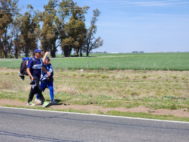 Partieron a las 5:00 de la mañana y se encuentran a menos de la mitad de camino. Van solos cantando como si estuvieran en la hinchada vivando al azul y blanco, que es una manera de acortar el camino, por momentos rememoran anécdotas vividas por el fútbol.