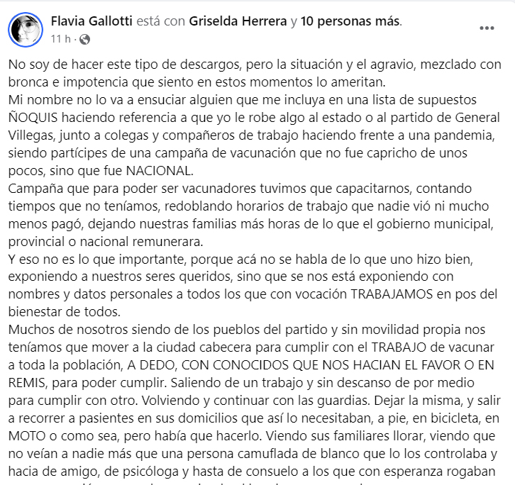 En medio del escándalo que significó, resulto que la lista en su gran mayoría son personas que estuvieron vinculadas a la Posta de Vacunación en todo el distrito; entre ellas, Flavia Galloti, la enfermera de Banderaló que fuera reconocida por el país entero cuando una vecina la fotografió a bordo de su ciclomotor recorriendo las calles del pueblo, vestida con mameluco blanco arriesgándolo todo por la gente, incluso por su vida y luego lo publicó.